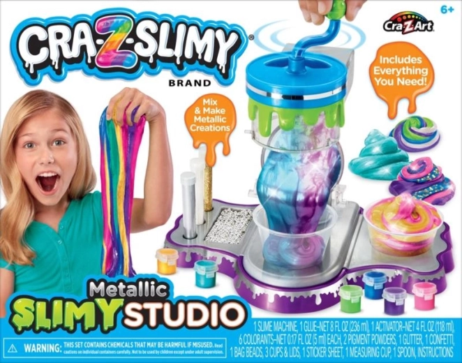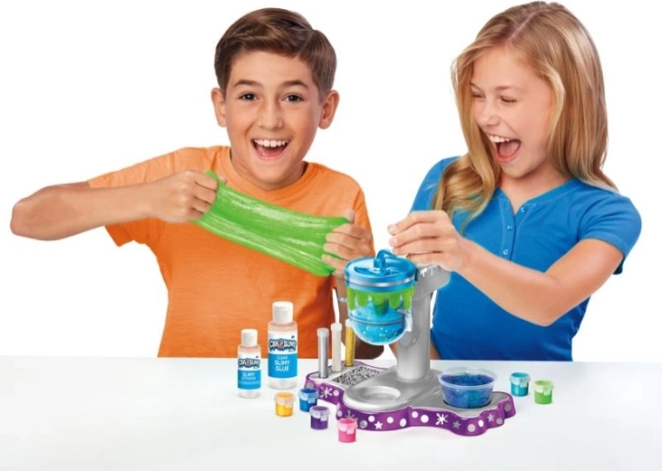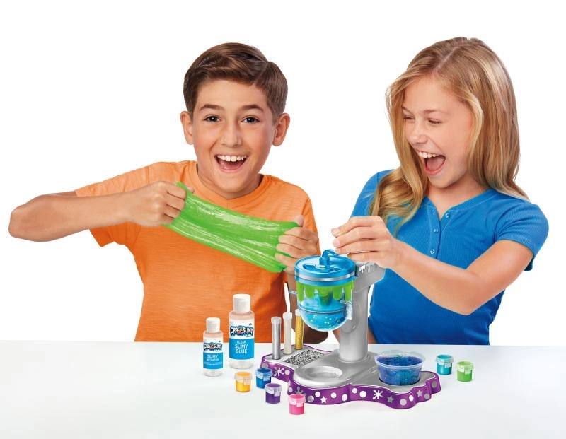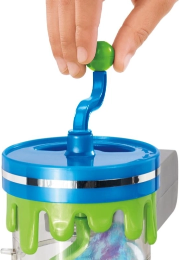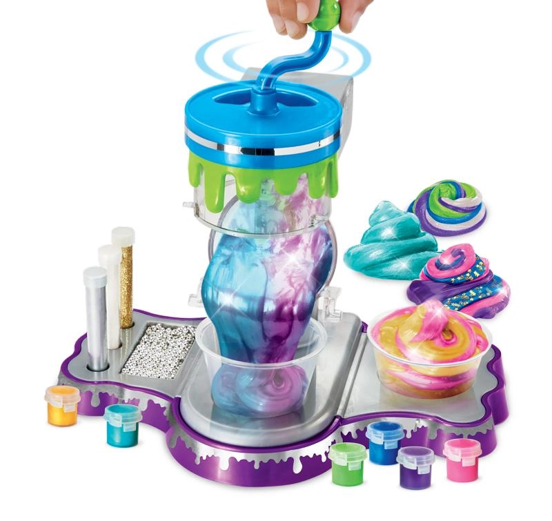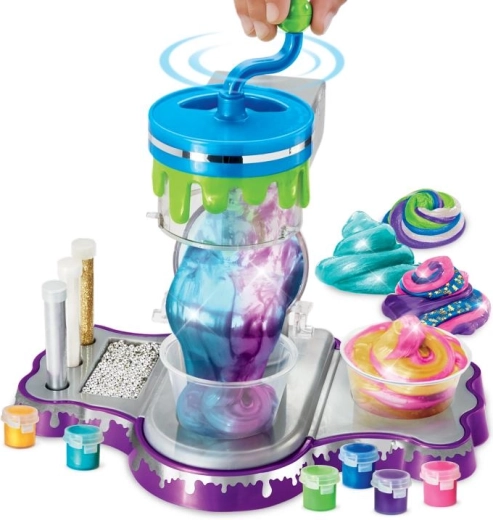 Einfach Kleber, Aktivator, Farben und Glitzer hinzufügen, dann an der Kurbel drehen und zusehen, wie sich der Schleim perfekt vermischt – ganz ohne Chaos und ohne Batterien.
