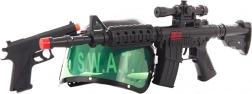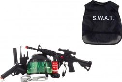 Das Polizei-Set enthält einen Helm, eine Weste, ein Maschinengewehr, ein Funkgerät, eine Pistole, einen Schlagstock, Handschellen, Kopfhörer und eine Granate. Material: Kunststoff. Verpackt in einer transparenten Kunststoffverpackung. Verpackungsmaße ca. 52 × 34 × 12 cm. Größe der Weste: 34 × 37 cm. Alter: 3+