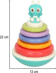 Dieser bunte Turm begeistert jedes Kind! Er besteht aus einer schaukelnden Basis mit einem kleinen Freund – einem Häschen – und fünf unterschiedlich großen Ringen. Die Aufgabe des Kindes ist es, sie nacheinander aufzustecken und so einen Regenbogenturm zu bauen. Nach jedem Aufstecken ertönt eine fröhliche Melodie, die das Kind zum weiteren Spielen motiviert.