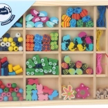 Die Box enthält eine große Auswahl an Formen und Farben, die zu grenzenloser Kreativität anregen. Dank der unterteilten Fächer bleibt das Auffädeln übersichtlich und macht Spaß – die perfekte Aktivität für zuhause und unterwegs.