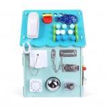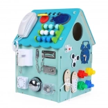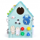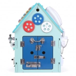 Dieses robuste Holz-Häuschen ist voller funktionaler Elemente, die Kinder zum Entdecken einladen. Von der Klingel über das Telefon bis hin zu verschiedenen Schlössern und Schnallen – jedes Detail unterstützt Selbstständigkeit und praktische Fähigkeiten durch Spiel. Die Farbgebung kann leicht in türkisfarbene Nuancen abweichen.