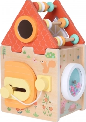 Dieses Spielzeug ist ideal für die Entwicklung von Kindern, da jede Seite des Häuschens ein neues Abenteuer verbirgt. Ob es ums Sortieren, Schieben oder Schlösser geht. Der Würfel enthält auch ein Rechenbrett, das als Dach des Häuschens dient.