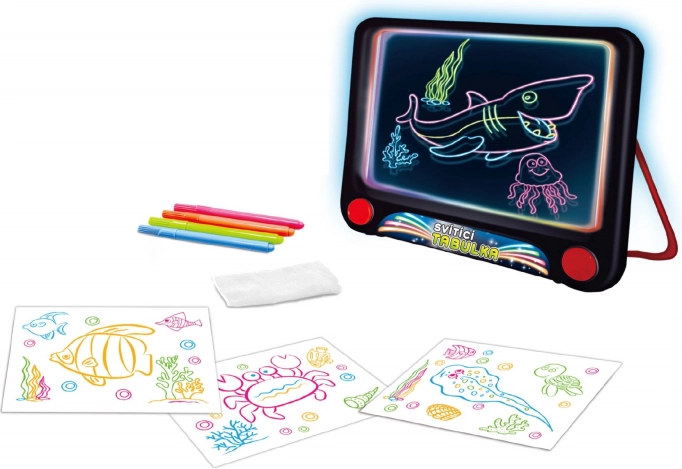 Dieses leuchtende Zeichentablett ist ein großartiges Werkzeug für kleine Künstler. Es ist mit bunten löschbaren Stiften und Schablonen ausgestattet, die es den Kindern ermöglichen, ihre Kreativität zu entfalten und gleichzeitig zu spielen. Im Lieferumfang ist auch ein Reinigungstuch enthalten, das es ermöglicht, einfach ein neues Werk zu beginnen.