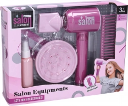 Kinderföhn mit Zubehör, Länge 19 cm, bereitet kleinen Friseurinnen große Freude. Er bläst tatsächlich Luft, bietet 2 Geschwindigkeiten und praktische Aufsätze. Enthalten sind ein Kamm und eine Fläschchen für Stylingprodukt für noch mehr Spaß. Ideal für das kreative Rollenspiel im Friseursalon.