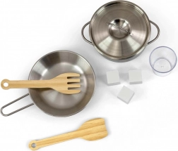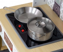 Im Lieferumfang: eine Pfanne aus Metall, ein Topf mit Deckel, ein hölzerner Wender und eine Gabel, ein transparenter Becher sowie 3 Eiswürfel. Die Küche wächst dank verstellbarer Verlängerungsteile der Füße mit dem Kind mit und sorgt so über viele Jahre für freudiges Spielen.