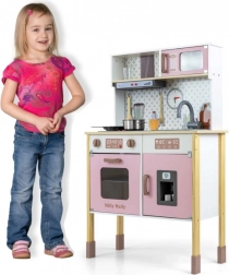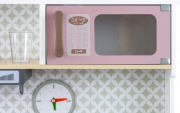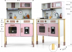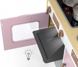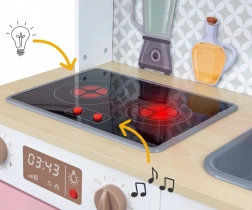 Zur Ausstattung gehören ein Backofen mit Sichtfenster, eine Mikrowelle, ein Kühlschrank mit realistischem Eiswürfelspender und ein einbeckeniges Spülbecken. Auf dem Panel befinden sich eine Dunstabzugshaube mit Licht und Sound, verschiebbare Haken zum Aufhängen von Zubehör sowie eine Uhr mit beweglichen Zeigern zum Erlernen der Uhrzeit. Illustrationen von Küchenelementen an der Wand regen Fantasie und thematisches Spiel an.