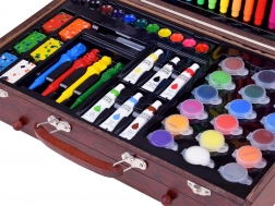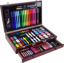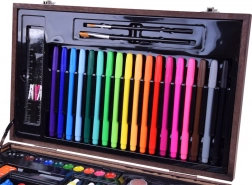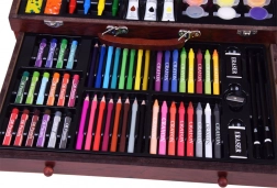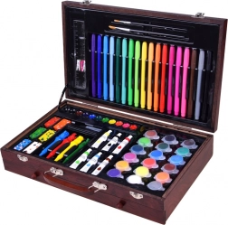 Der Holzkoffer mit den Abmessungen 37 cm x 23 cm x 7,5 cm sorgt für einfaches Tragen und Verstauen aller Kunstmaterialien.