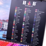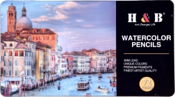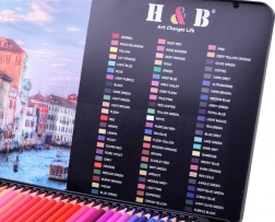 Die Stifte sind in einem Metalletui mit künstlerischem Motiv und Farbnamen auf Englisch angeordnet, ideal für Transport und Lagerung.