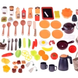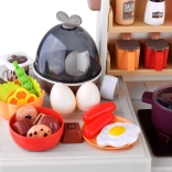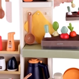 Die interaktive LED-Dunstabzugshaube mit Melodien, der Eikocher mit Licht und Ton sowie die Kreidetafel für das Menü fördern Fantasie und Feinmotorik. Die Küche bietet viel Stauraum – Regale, Schubladen, Haken – und ein umfangreiches Set an Geschirr, Lebensmitteln und Gewürzen für endlose Rollenspielszenarien.