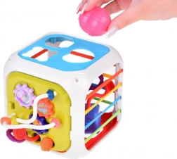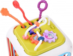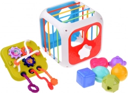 Dieser farbenfrohe Lernwürfel aus hochwertigem Kunststoff bündelt beliebte Aktivitäten kleiner Kinder in einer kompakten Einheit. Zwei Seiten dienen als Formensortierer mit verschiedenen Öffnungen, drei weitere sind mit elastischen Gummibändern zum Durchschieben der Klötzchen und zum Training des Tastsinns ausgestattet. Die beidseitige Panelwand ergänzt auf der einen Seite ein Glockenspiel und Ziehbändchen mit unterschiedlicher Textur und auf der anderen Seite Zahnräder und Schiebesperlen.