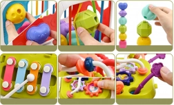 Zwei Seiten mit Öffnungen in verschiedenen Formen und 6 farbigen Klötzchen/Rasseln lehren Kinder, Formen zu erkennen, trainieren die Hand-Auge-Koordination und unterstützen das logische Denken.