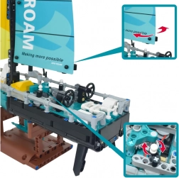 Steuern Sie Ruder und Lenkung, bedienen Sie die Winsch und passen Sie die Segelstellung an. Die mechanischen Elemente sorgen für interaktives Bauen und Spielen.