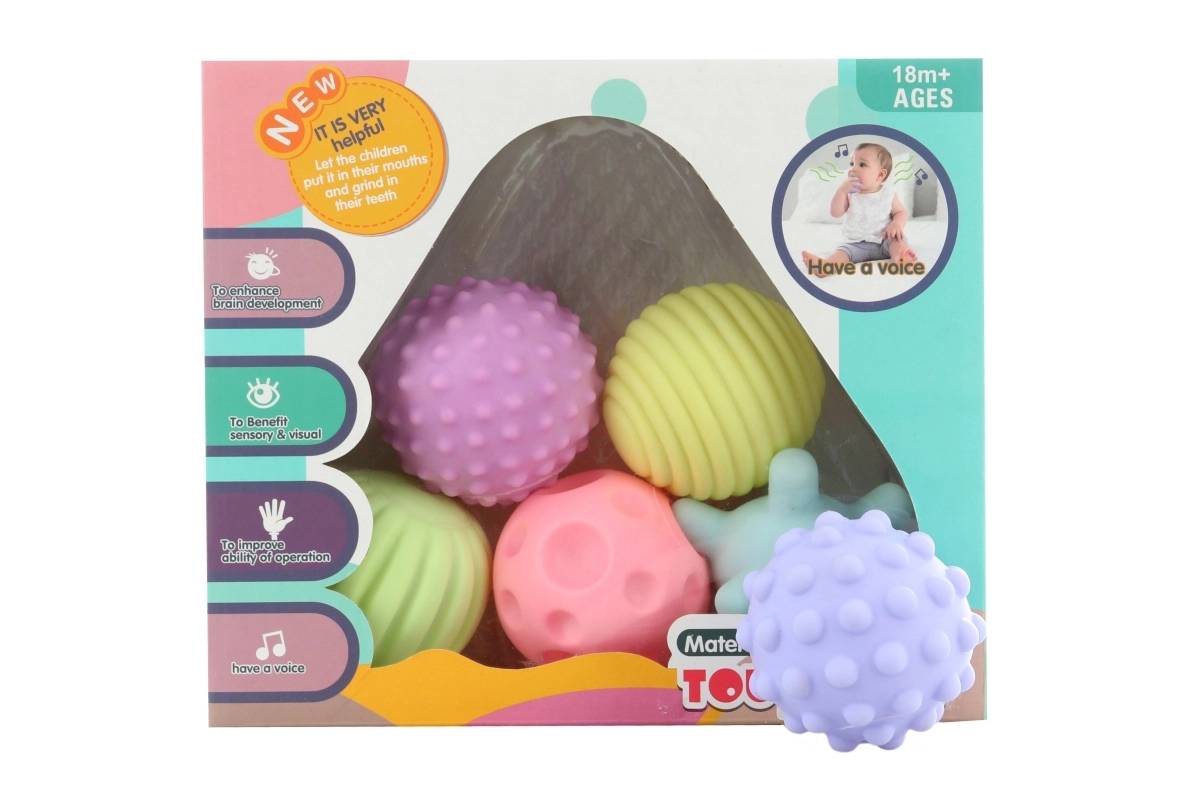 Set aus sensorischen Bällen für die Kleinsten. Die Bälle haben verschiedene Formen und Farben. Die Bälle quietschen. Verpackt in einer Schachtel. Verpackungsmaße ca. 21×18×7 cm. Ballgröße ca. 5–6 cm. Alter 18M+
