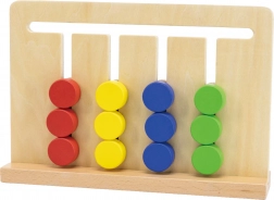 Die übersichtliche Tafel mit vier Schienen und zwölf Klötzen unterstützt systematisches Sortieren, Verschieben und das Planen der richtigen Schrittfolge.