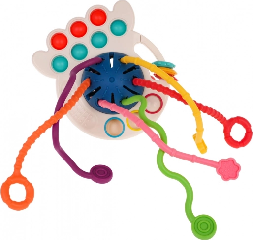 Sensorisches 4-in-1-Spielzeug, Krake, für Kinder ab 18 Monaten. Das Spielzeug besteht aus kindersicheren Materialien und hat keine scharfen Kanten. Lebendige Farben animieren das Kind zum Spielen. Das Spielzeug kann als Beißring verwendet werden; das Kleinkind kann daran ziehen, schieben, verschiedene Elemente bewegen und die Hand-Auge-Koordination üben. Das Spielzeug kann am Kinderbett, Kinderwagen oder Autositz auf Reisen im Auto befestigt werden.