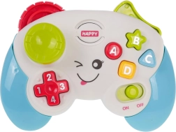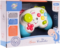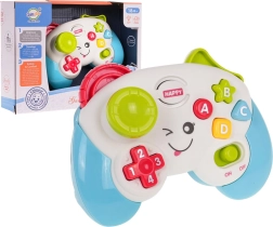 Der Spielcontroller hat ein weißes Gehäuse mit blauen Griffen und farbigen Tasten, die die Sinne der Kinder anregen und visuelle Unterhaltung bieten.