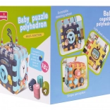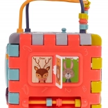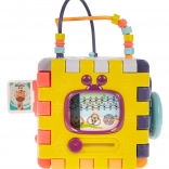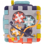 Die Oberseite bietet Zahnräder und Perlen zur Übung der Hand-Auge-Koordination. Der Formensortierer mit 4 bunten Bausteinen unterstützt das Erkennen von Formen und logisches Denken. Der Würfel besteht aus robustem Kunststoff in leuchtenden Farben und motiviert durch seine Verarbeitung zum Entdecken und zum selbstständigen Spiel.