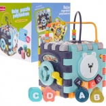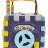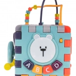 Dieser clevere Kinderwürfel lässt sich leicht flach ausklappen, sodass das Kind mit den einzelnen Paneelen separat spielen kann. Die interaktive Seite mit dem Bären besticht durch einen leuchtenden Kopf und die Tasten A, B, C, D, die Melodien abspielen und Buchstaben auf Englisch vermitteln. Außerdem gibt es ein Lenkrad mit „Schalthebel“, Schieberegler, Dreh-Elemente und ein kleines Drehbüchlein.