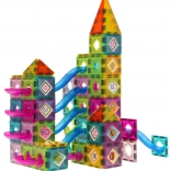 Dieses umfangreiche Konstruktionsset kombiniert magnetische Platten mit Elementen für Murmelbahnen, sodass Kinder ab 3 Jahren Türme, Schlösser und originelle Strecken für bunte Murmeln bauen können. Die Teile bestehen aus hochwertigem, glattem Kunststoff in kräftigen Farben, die magnetischen Kanten verbinden sich leicht und fest und die Konstruktionen halten auch bei höheren Bauten gut.