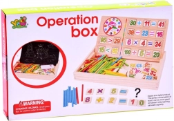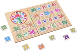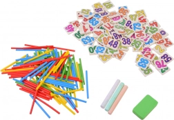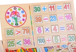 Die zweiseitige Tafel bietet zwei Flächen: eine Kreideseite zum Schreiben, Zeichnen und Lösen von Aufgaben sowie eine Bildseite zum Zuordnen der richtigen Ziffern zu den Illustrationen. Zählstäbchen vermitteln grundlegende Arithmetik anschaulich und spielerisch.