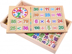 Alle Teile sind in einer robusten Holzbox verstaut. Der Deckel dient als Tafel – so ist das Lernen immer griffbereit.