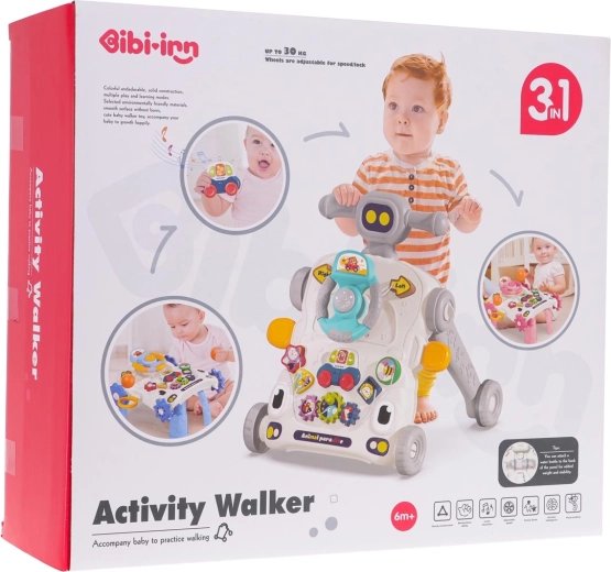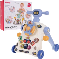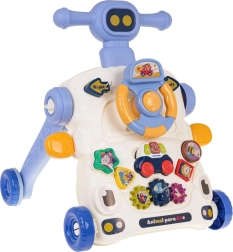 Das abnehmbare interaktive Auto bietet Licht- und Soundeffekte (Melodien, Motorstart, Fahrgeräusch, Kinderlachen, Klingeln), die zum Entdecken anregen. Dank der zweistufig verstellbaren Griffhöhe und der Gummiräder ist die Bewegung sanft und sicher. Die Umwandlung zum Tisch ist schnell und einfach – ideal zum Spielen im Sitzen.