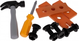 Hammer, Schraubendreher, Schrauben, Lochleisten und weiteres Zubehör eröffnen Raum für freies Bauen, das Training der Feinmotorik und die Entwicklung der Vorstellungskraft.