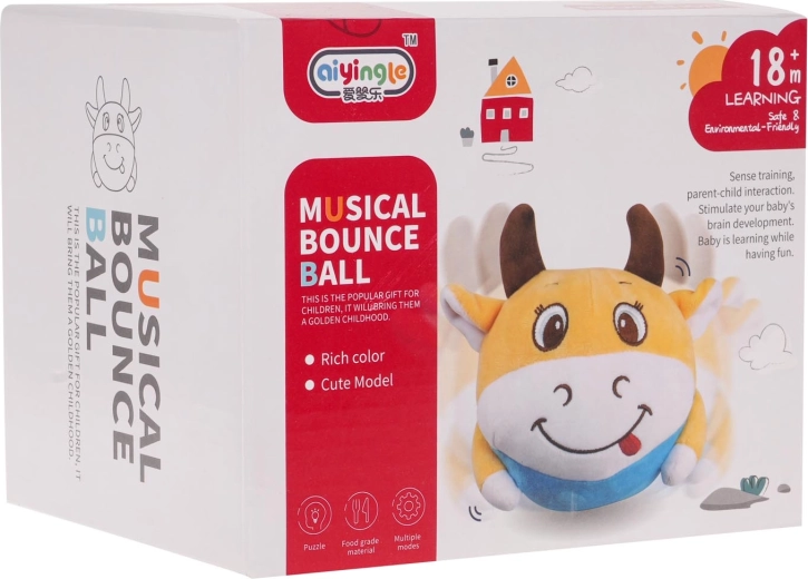 Die fröhliche hüpfende Kuh ist ein weiches interaktives Plüschtier für die Kleinsten. Im Inneren befindet sich ein herausnehmbares rundes Funktionsmodul, dank dem sie nach dem Einschalten hüpft, sich bewegt und Melodien spielt und zugleich mit grüner Hintergrundbeleuchtung leuchtet. Die Bedienung wird durch die mitgelieferte Fernbedienung erleichtert, die Stromversorgung übernimmt ein wiederaufladbarer Akku mit Aufladung über USB.