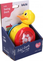 Bunte Ente auf Rädern zieht durch schaukelnde Bewegungen und rasselnde Geräusche kleiner Kugeln die Aufmerksamkeit der Kinder auf sich.