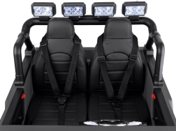 Das Multimedia-Panel bietet Radio, vorinstallierte Melodien und einen USB-Anschluss für eigene Musik. Der Fahrtrichtungswähler (vorwärts/stop/rückwärts), zwei Geschwindigkeiten und leistungsstarke LED-Leuchten vorne und am Rahmen sorgen für Spaß bei Tag und Nacht. Weiche EVA-Räder und der 4x4-Antrieb meistern Gras, Unebenheiten und leichte Steigungen.