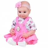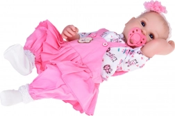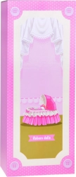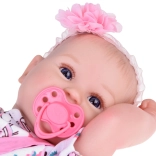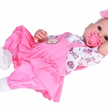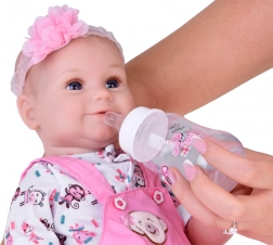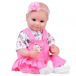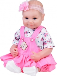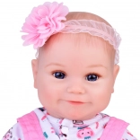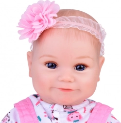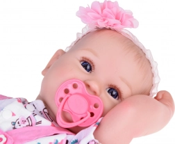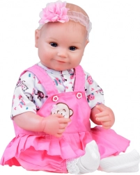 Diese niedliche Babypuppe ist aus hochwertigen Materialien mit Liebe zum Detail gefertigt – sie hat einen weichen Körper, bewegliche Gummi-Ärmchen und -Beinchen sowie realistische Gesichtszüge mit blauen Augen und langen Wimpern. Der Kopf hat gemalte Haare, wodurch sie auch für die jüngsten kleinen Pflegerinnen ideal ist. Das Outfit in Rosatönen mit Tiermotiven und einem Blumen-Haarband verleiht der Puppe einen zarten, lieblichen Look.