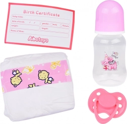 Enthalten sind Fläschchen, magnetischer Schnuller, Windel und Geburtsurkunde – alles für eine realistische Babypflege.