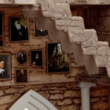 Kleines Modell eines Raumes mit antikem Stein und gotischen Bogenfenstern. Rote Stühle um den Kamin heben den gotischen Stil hervor.
