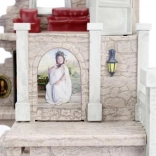 Steinminiatur der Burg mit Säulen und einer kleinen Außenlampe, geeignet zum Ausstellen oder Spielen.