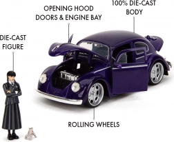 Betreten Sie die dunkel-elegante Welt der Addams Family. Dieses detailreich gestaltete Metallmodell des Volkswagen Beetle 1972 im Maßstab 1:24 (ca. 19 cm) wird durch die authentische Figur von Wednesday Addams und die ikonische Hand (Thing) zum Befestigen an der Stoßstange ergänzt. Realistische verchromte Elemente und stimmige Proportionen machen ihn zu einem Blickfang in der Vitrine und zu einem originellen Geschenk.