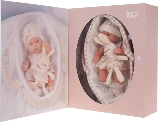 Babypuppe, tragbarer Textilkorb mit Griffen, Plüschhäschen, Geschenkverpackung