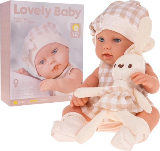 Eine niedliche Babypuppe mit weichem Tragkörbchen und Plüschhäschen erfreut jedes Kind ab 3 Jahren. Das Set ist hochwertig verarbeitet, hat bewegliche Arme, Beine und einen beweglichen Kopf, leicht ausziehbare Kleidung und einen Textilkorb mit Griffen für bequemes Tragen. Das Spiel mit der Puppe fördert die Feinmotorik und die Fantasie.