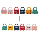 Dieses clevere Lernspielzeug verbindet Spaß mit sinnvoller Förderung. Jedes Fahrzeug ist ein Schloss, zu dem ein bärenförmiger Schlüssel mit eingeprägter Zahl 0–5 gehört. So trainiert das Kind auf natürliche Weise Feinmotorik, logisches Denken und Zahlerkennung. Der obere Teil des Schlosses lässt sich um 360° drehen; nach dem richtigen Aufschließen lassen sich die Fahrzeuge leicht zu einem langen Zug verbinden.