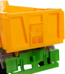 Der Anhänger mit hydraulischer Kippfunktion entlädt die Ladung im Handumdrehen. Eine zu öffnende Rückbordwand und eine Schiebeluke ermöglichen das Dosieren in kleineren Mengen, während der vordere Stützfuß den Anhänger beim Kippen stabilisiert. Glatte Flächen aus ABS-Kunststoff lassen sich schnell mit einem feuchten Tuch reinigen, sodass das Spiel jeden Tag weitergehen kann.