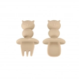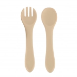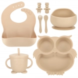 Dieses beige Silikon-Essset erleichtert Kindern das selbstständige Essen und sorgt bei Eltern für entspannteres Mahlzeiten-Handling. Saugnäpfe an Teller und Schüssel verhindern das Umkippen, der Becher mit Strohhalm unterstützt eigenständiges Trinken und das Lätzchen mit tiefer Tasche fängt herunterfallende Stücke auf.