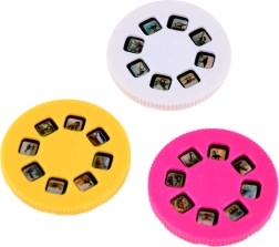 Enthält drei bunte Kunststoffdiscs mit mehreren Bildern, die sich leicht für unterschiedliche Projektionen wechseln lassen.