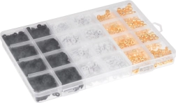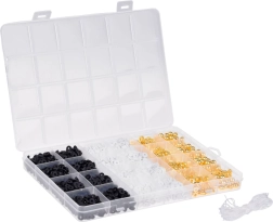 Das Set enthält eine durchsichtige Plastikbox, die in mehrere Fächer unterteilt ist. Dies ermöglicht einen einfachen Zugriff und die Organisation der Perlen in verschiedenen Stilen und Farben.