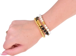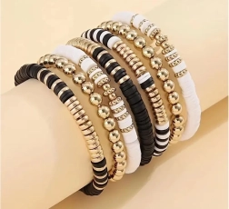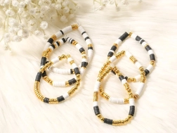Stilvolle Armbänder aus diesem Set bestehen aus schwarzen, weißen und goldenen Perlen, die einen hochwertigen Lagen-Look erzeugen, ideal für jeden Anlass.