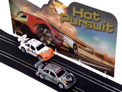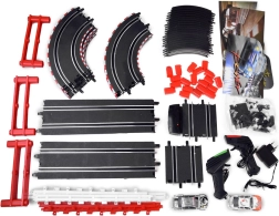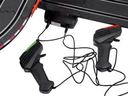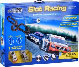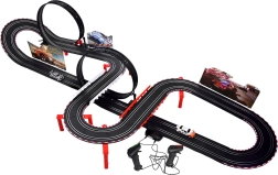 Die Rennstrecke mit einer Länge von 912 cm ist im Maßstab 1:43 gefertigt, was ein realistisches Aussehen gewährleistet. Zwei hochgeschwindigkeits Autos halten hervorragend auf der Strecke. Die Steuerung der Fahrzeuge erfolgt über zwei Joysticks, die die Geschwindigkeitsregelung ermöglichen. Der Spaß ist ohne Batterien sichergestellt, die Autos werden über einen Adapter betrieben.