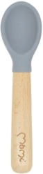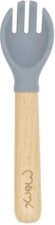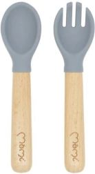 Rutschfeste Saugnäpfe und ein geteilter Teller helfen Kindern dabei, ordentlich zu essen. Das Besteck aus Naturholz ist ideal für kleine Hände.