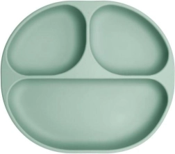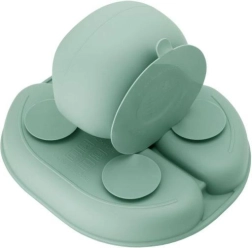 Erhöhte Ränder und Saugnäpfe auf der Unterseite sorgen dafür, dass das Geschirrset fest auf dem Tisch bleibt. Die angepasste Größe des Bestecks ist ideal für kleine Hände, die lernen, selbstständig zu essen.