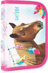 Das Set enthält einen Rucksack mit reflektierenden Elementen, einen Turnbeutel mit Kordelzug und ein einteiliges Federmäppchen ohne Füllung – alles im aufeinander abgestimmten Design mit Pferd.