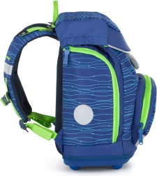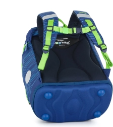 Ergonomie steht an erster Stelle: die anatomisch geformte Rückenpartie (Länge 33 cm), gepolsterte Schulterriemen und ein verstellbarer Brustgurt unterstützen eine korrekte Körperhaltung. Der feste Boden mit Kunststofffüßen verhindert das Umkippen, reflektierende Elemente erhöhen die Sicherheit auf dem Schulweg. Dank der austauschbaren Klett-Buttons können Kinder das Design des Rucksacks leicht personalisieren.