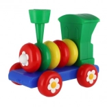 Der Zug besteht aus Plastik in auffälligen Farben, die die Aufmerksamkeit der Kinder auf sich ziehen, und ist mit Blumenmotiven auf den Rädern verziert.