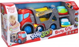 Mit diesem Kiddy-Abschleppset erleben Kinder realistischen Spielspaß. Der Abschleppwagen mit zwei Plattformen und klappbarer Rampe ermöglicht das einfache Aufladen der beiliegenden Autos, während Licht- und Soundeffekte für authentische Atmosphäre sorgen. Dank der freilaufenden Räder rollen die Fahrzeuge sanft über den Boden.